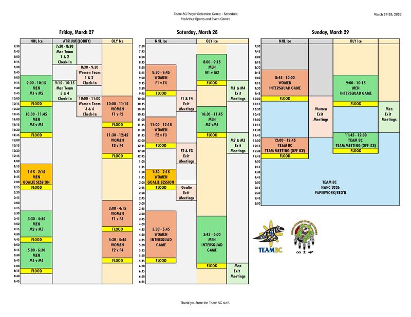 I·SPARC has released the schedules and scrimmage teams for the 2026 Team BC Selection Camp.