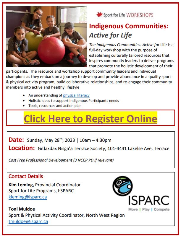 kleming@isparc.caRegistration is open to coaches, community leaders (aged 16+) who work with or support Indigenous youth in sport and physical activity recreation programs! Please feel free to invite and share the information.