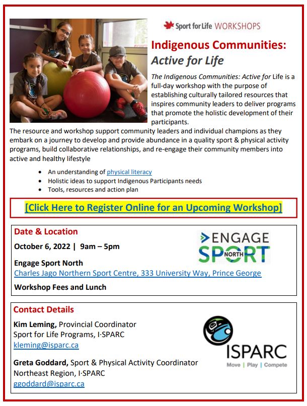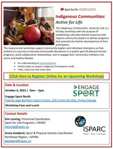 The Indigenous Communities: Active for Life is a full-day workshop with the purpose of establishing culturally tailored resources that inspires community leaders to deliver programs that promote the holistic development of their participants.