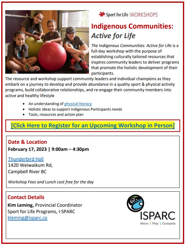The Indigenous Communities: Active for Life is a full-day workshop with the purpose of establishing culturally tailored resources that inspires community leaders to deliver programs that promote the holistic development of their participants.
