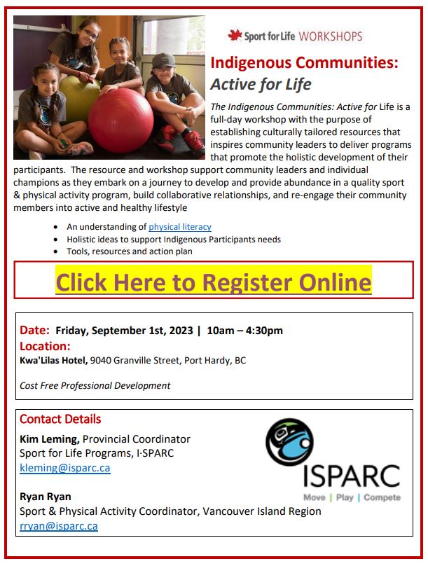 kleming@isparc.caRegistration is open to coaches, community leaders (aged 16+) who work with or support Indigenous youth in sport and physical activity recreation programs! Please feel free to invite and share the information.