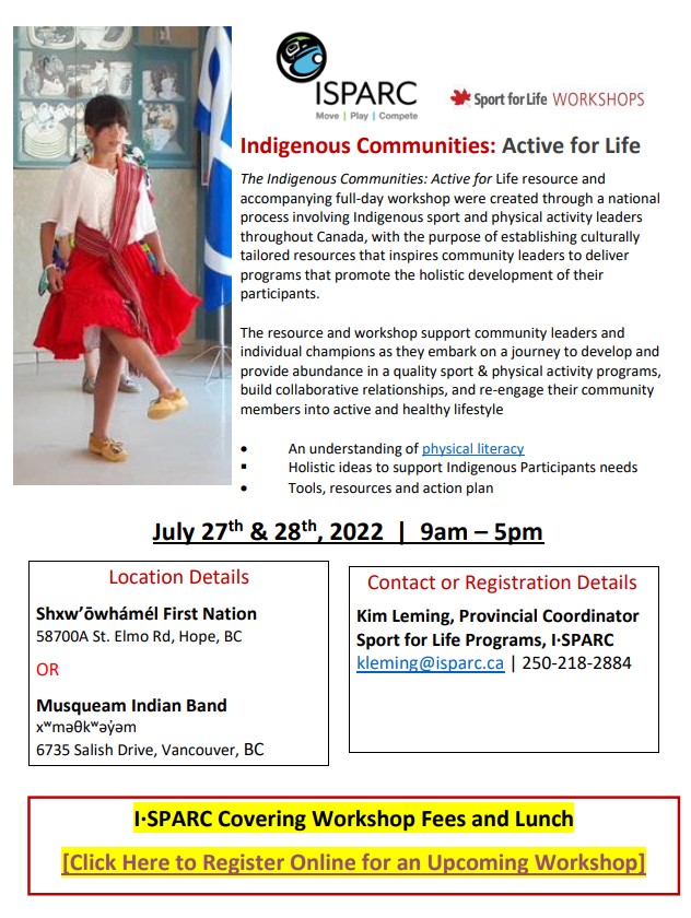 The Indigenous Communities: Active for Life resource and accompanying full-day workshop were created through a national process involving Indigenous sport and physical activity leaders throughout Canada, with the purpose of establishing culturally tailored resources that inspires community leaders to deliver programs that promote the holistic development of their participants.