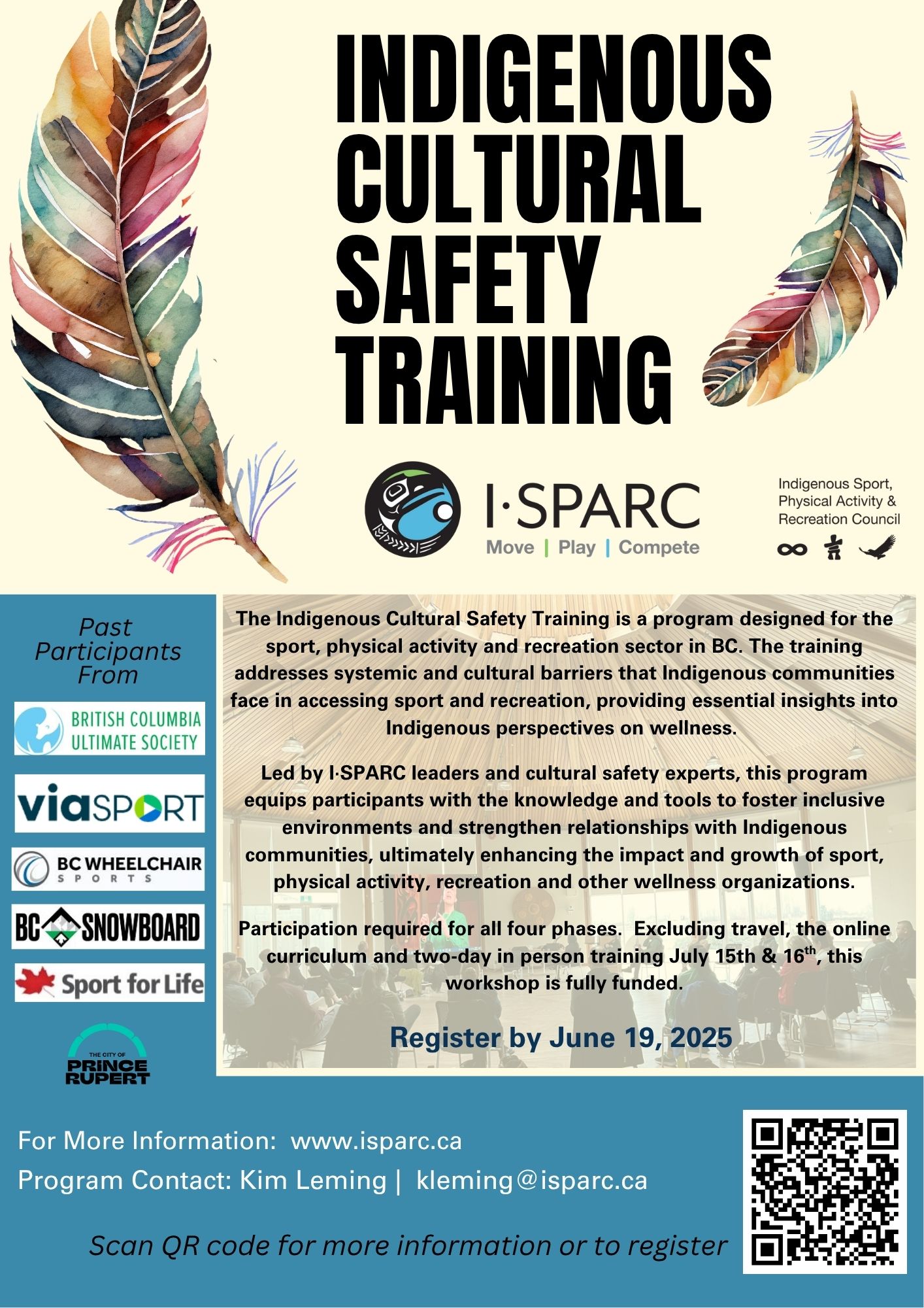 Lead by the Indigenous Sport, Physical Activity, and Recreational Council of BC (I∙SPARC). This series of sessions led by I∙SPARC facilitators and Knowledge Keepers will provide Indigenous Cultural Safety Training with through the lens of sport, physical activity, and recreation. This training and team-building opportunity will increase confidence and competence when building relationships with Indigenous People. This professional development training is highly recommended and includes four phases (both online and in-person): please see details in the Professional Development Schedule below. Participants should set aside approximately 18-20 hours for this learning experience and expect to participate in all four phases.