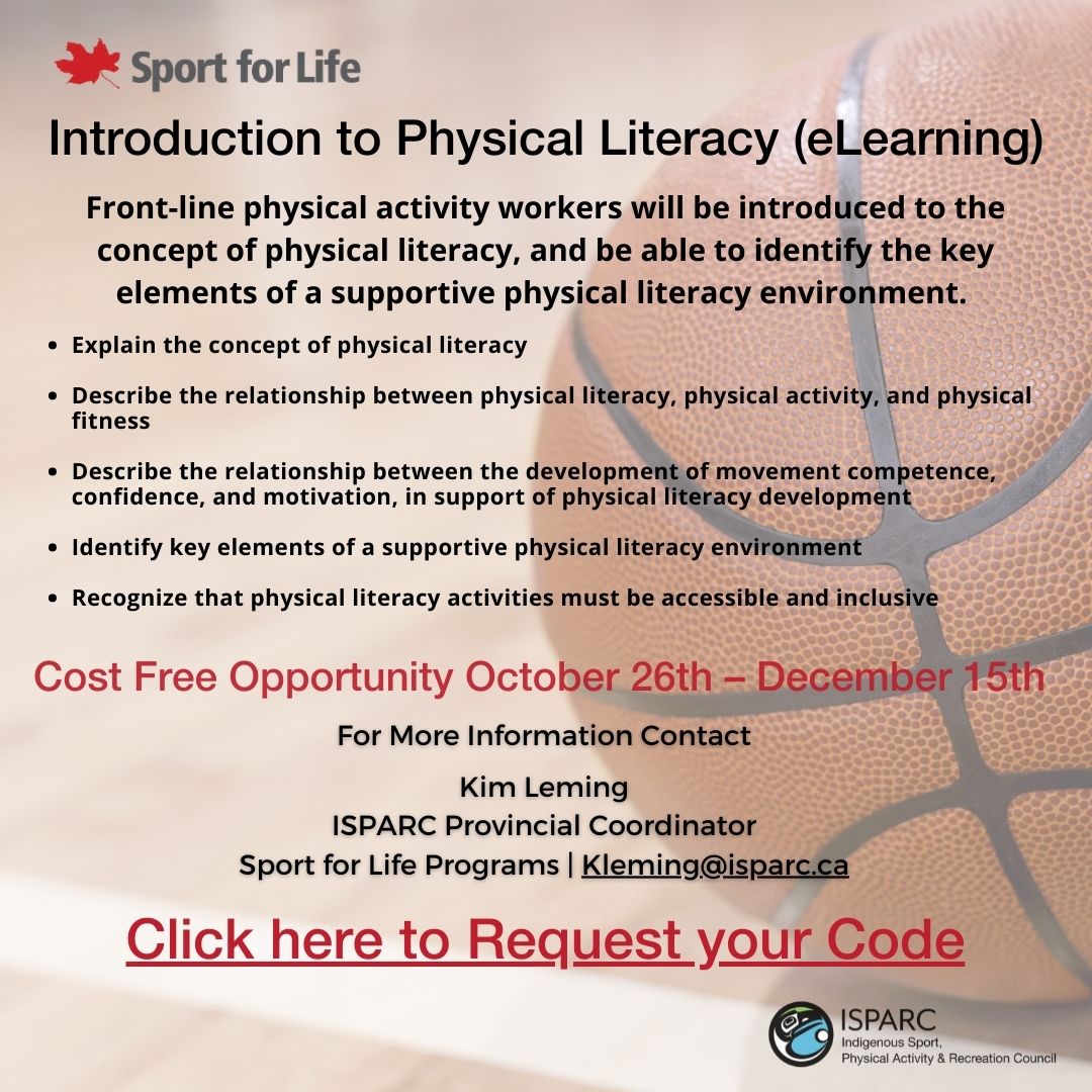 Online request form for a Sport for Life, E-learning Introduction to Physical Literacy. ISPARC will be covering the workshop associated fee during the month of November for participants in BC.