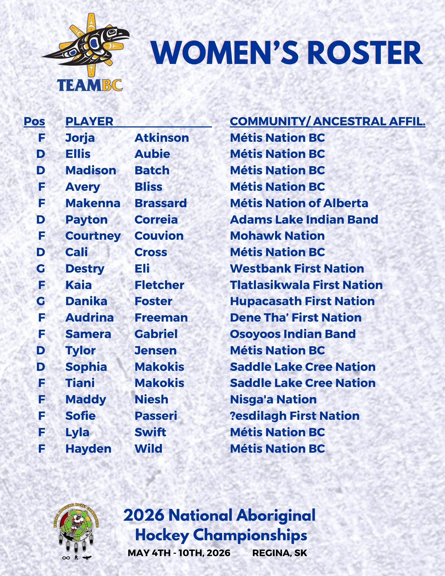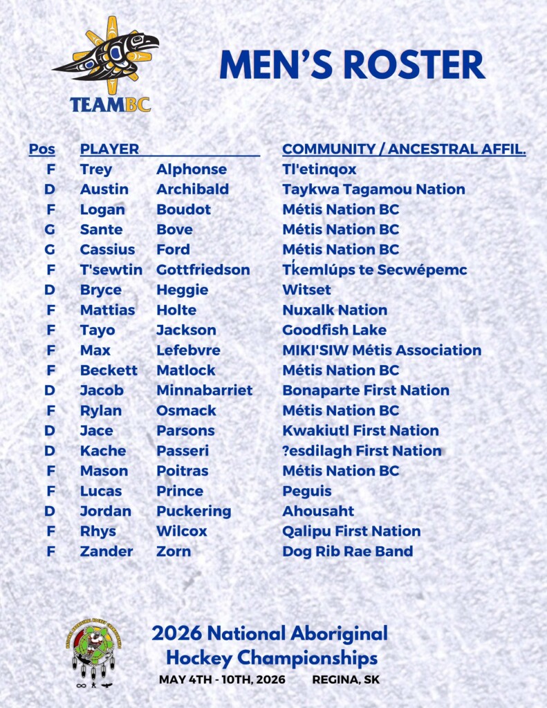 I∙SPARC is pleased to announce the players who will represent British Columbia in the 2026 National Aboriginal Hockey Championships (NAHC).